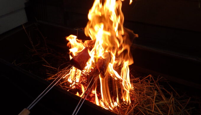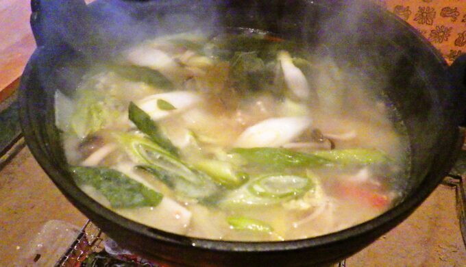 自在鈎からぶらさがる鍋には、味噌仕込みの野菜・鶏肉がたっぷり