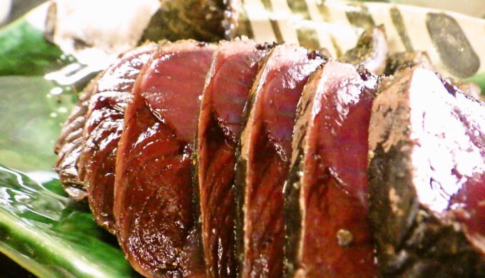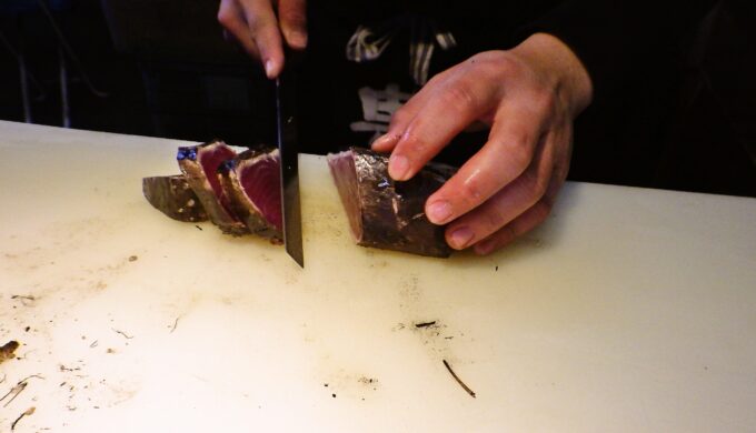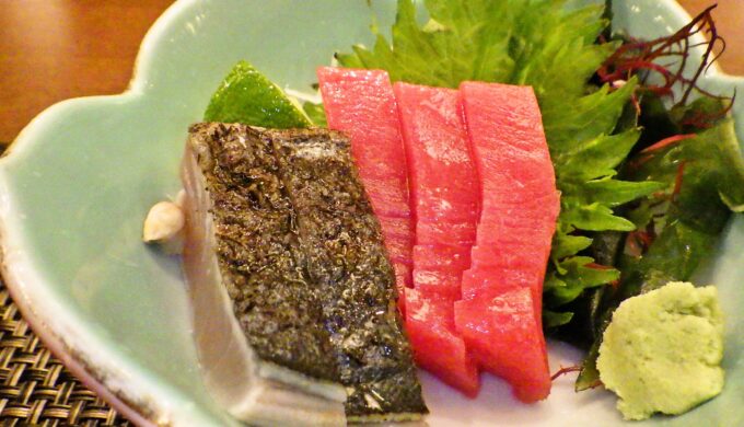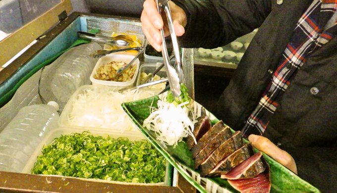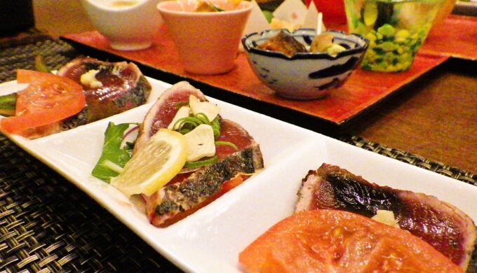 鰹のタタキは左から「塩ダレ」「ポン酢」「いご鉄の塩」でいただく