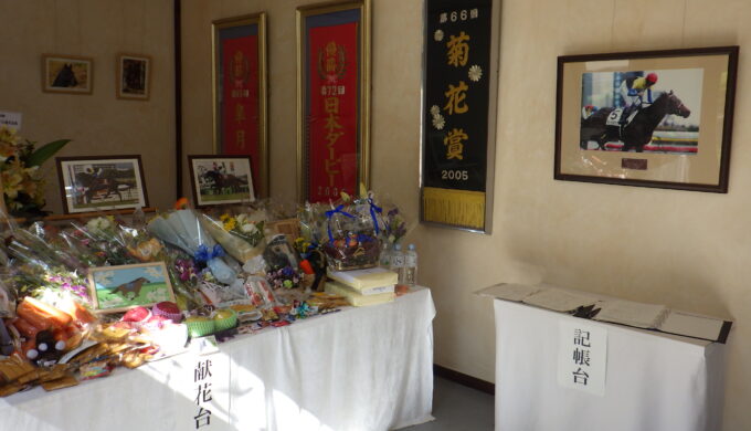 ノーザンホースパーク内の厩舎に設けられた献花台