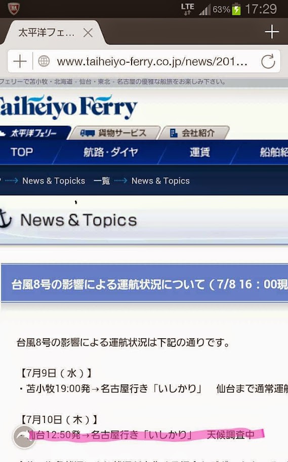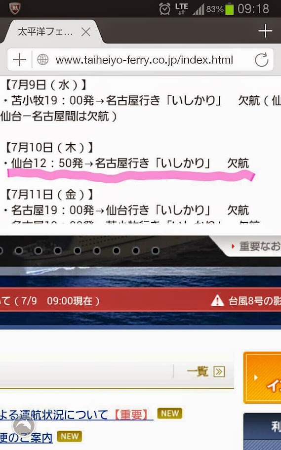 ブログ更新の後、太平洋フェリーのサイトを確認すると